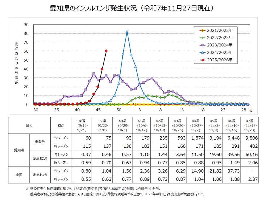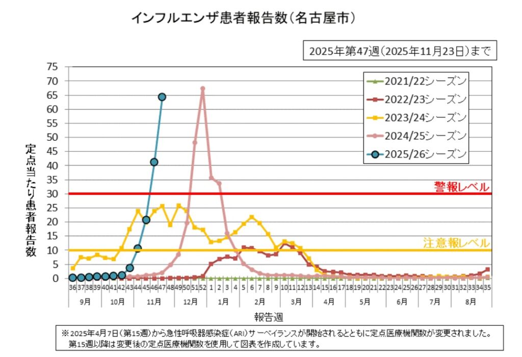 11月17日~23日の定点医療機関あたりのインフルエンザ報告数で愛知県は60.16、名古屋市は64.34でともに警報レベルの30を大きく上回っています。